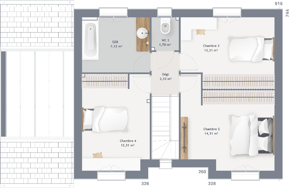 De nombreuses prestations incluses: tuiles en terre cuite, menuiseries couleur, volets motorisés et centralisés (coffret non visible intégré dans le mur), pack domotique, RDC et pièces d’eau carrelage imitation parquet, construction en brique, charpente traditionnelle, RE 2020, assurances incluses.