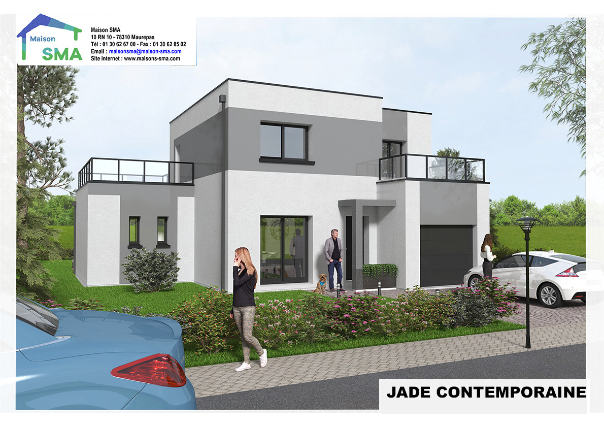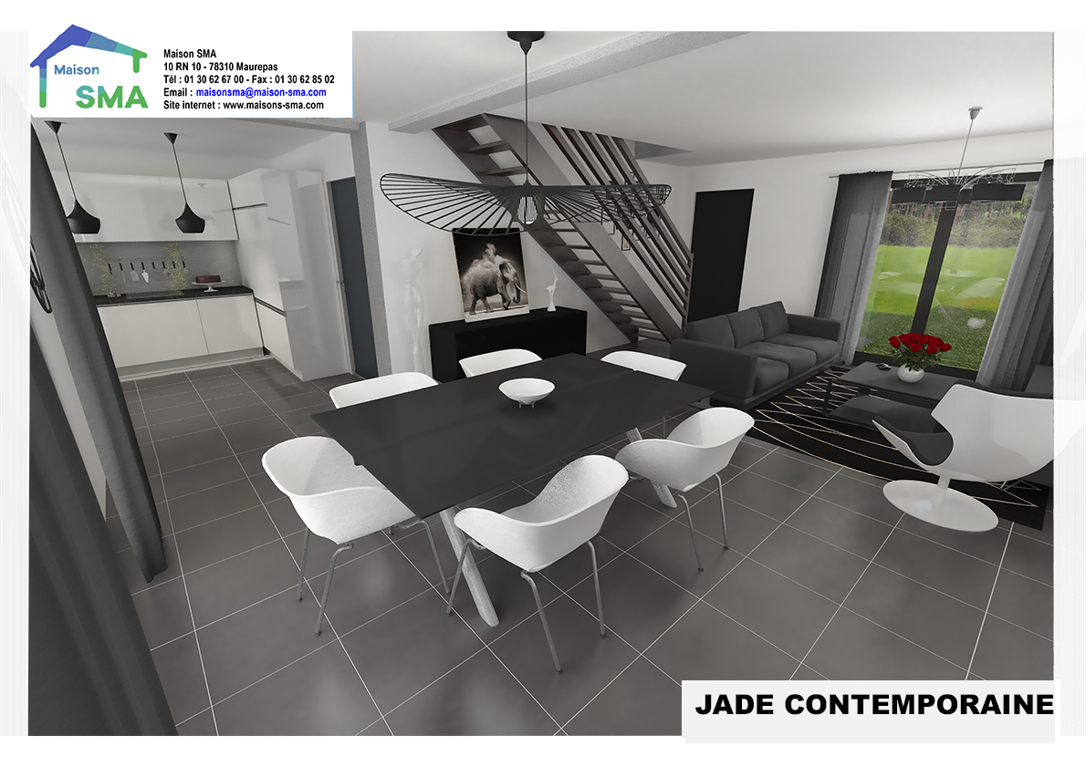 Notre modèle JADE CONTEMPORAINE se distingue par son architecture moderne. Cette Architecture se retrouve également à l’intérieur de la maison par le fonctionnement de l’espace vie du RDC, de l’accès direct au cellier, des 3 chambres au 1er étage ainsi que l’accès direct à la terrasse.