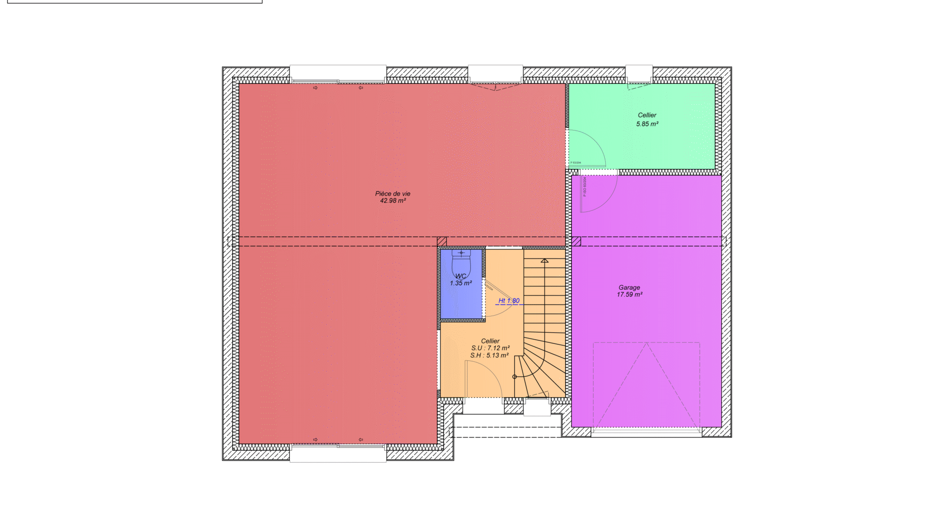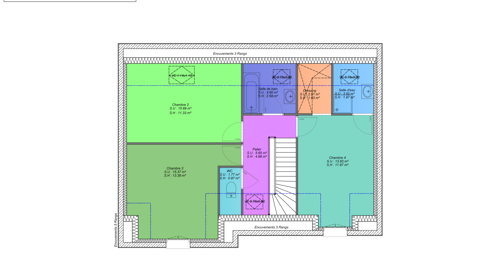 Maison de 103 m² avec un garage intégré de 17 m², et 3 chambres dont 1 suite parentale avec dressing et salle d’eau, 1 salle de bains et WC séparés à l’étage.